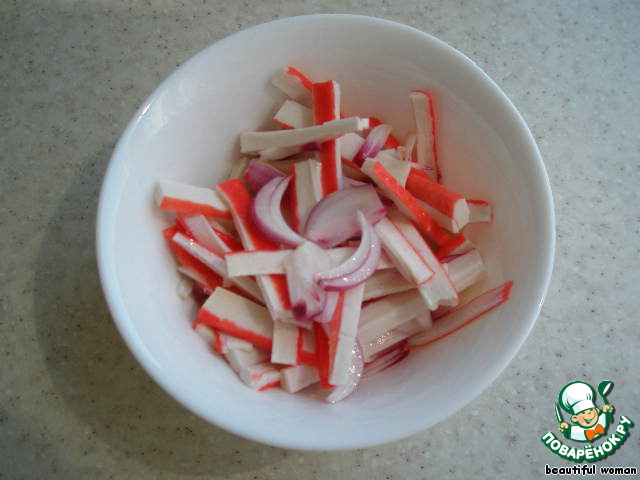Замаринуем лук и крабовые палочки на 20 минут в нашей заправке. Именно этот кулинарный ход и придаст будущему салату особую пикантность.