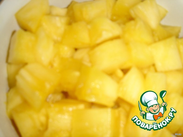 Половину крупного ананаса очистить от шкурки и порезать кубиками.