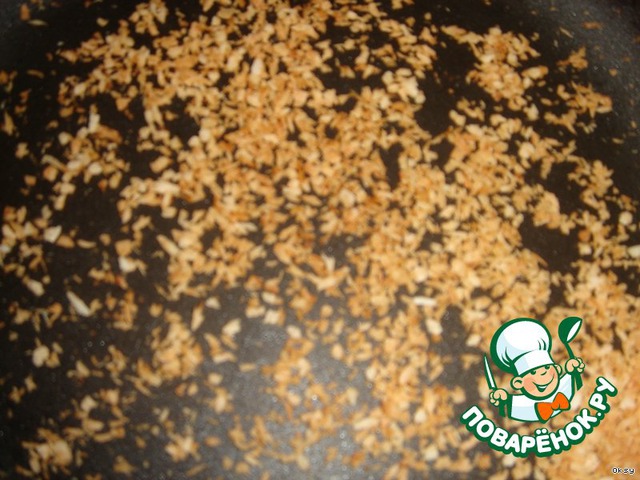 Перед подачей необходимо поджарить на сухой сковороде кокосовую стружку и посыпать ей салат.
