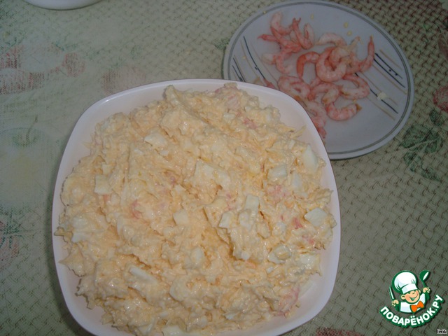 На мелкой тёрке трём сыр и чеснок, очищаем креветки, яйца мелко режем.