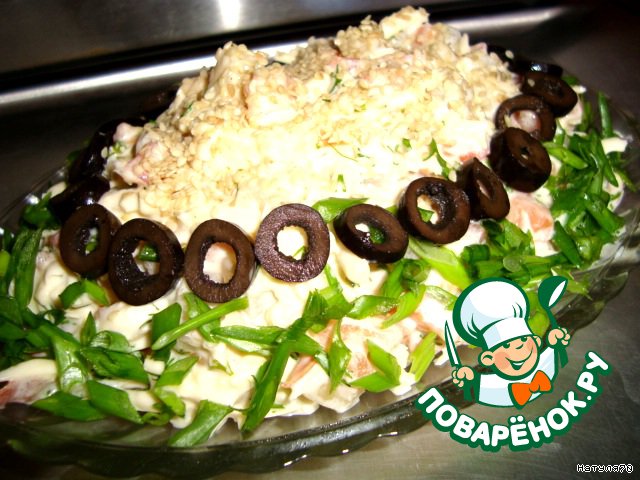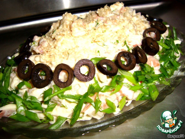 Для заправки смешиваем майонез, лимонный сок, измельченный чеснок и черный перец. Заправляем салат, перемешиваем, украшаем маслинами и посыпаем сверху кунжутом. Очень вкусно! Угощайтесь, мои хорошие)))