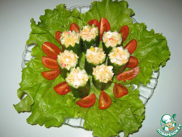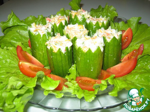 Наполняем свечи-огурцы салатом. Лучше это сделать непосредственно перед подачей, чтобы огурцы не размокли.