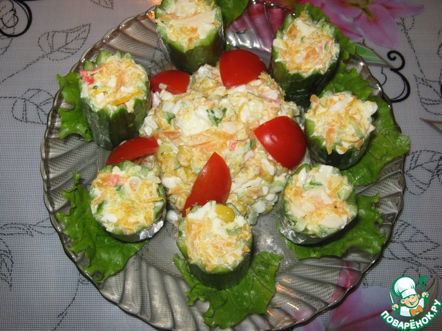 У меня огурцы были в диаметре небольшие, лучше взять потолще, т. к. больше салата поместится внутрь огурца-свечи.