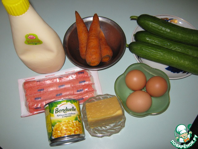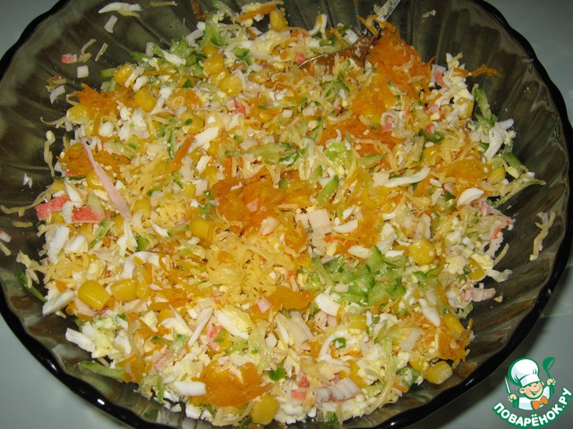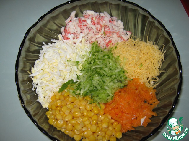 Мне больше нравится второе, т. к. после разморозки я отжимаю воду из крабовых палочек, чтобы не было лишней влаги в салате. Добавляем кукурузу, огурцы (на терке), которые остались после нарезки свечек.