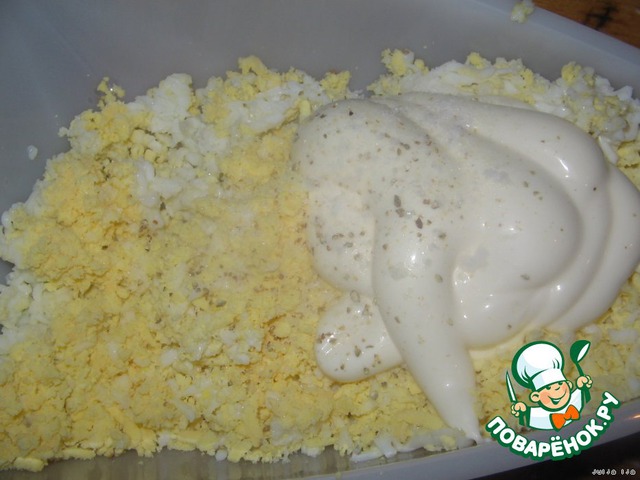 Яйца натереть на мелкой тёрке, посолить, поперчить - по вкусу.