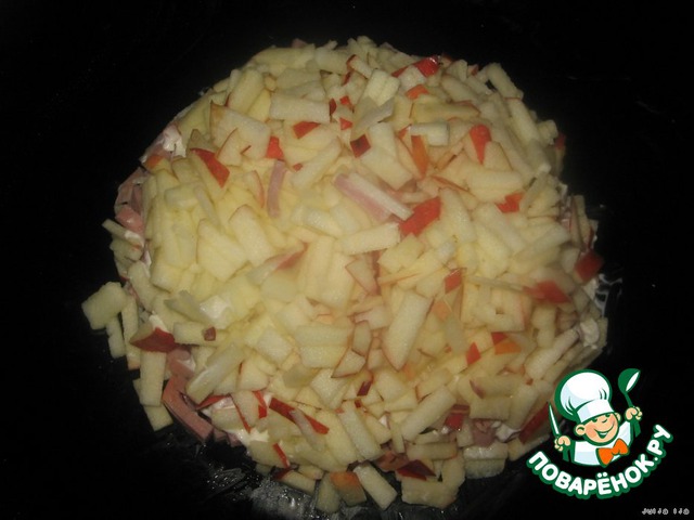 Вторым слоем выложить нарезанное соломкой яблоко (лучше кисло-сладкое). Немного смазать майонезом. Посолить и поперчить - по вкусу.