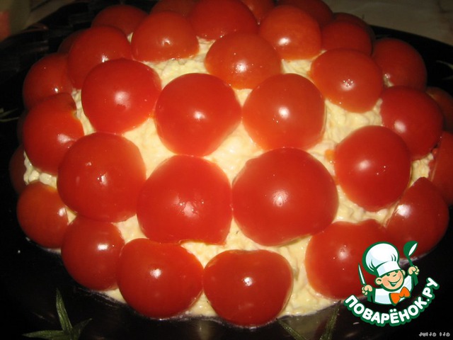 Для оформления помидоры черри разрезать пополам (у меня были крупненькие, потому ушло приблизительно 20 штук, если будут меньше, их понадобится больше).