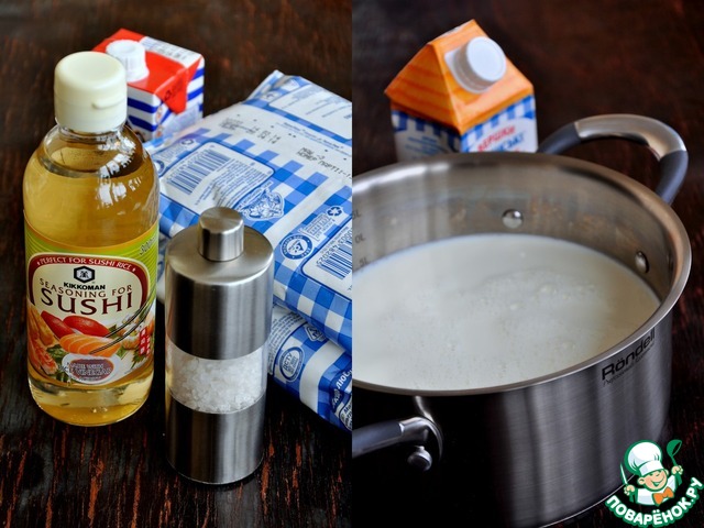 1,5 литра молока, 500г жирных сливок, 3 ст. л. рисового уксуса "Киккоман" и 1 ч. л. морской соли.