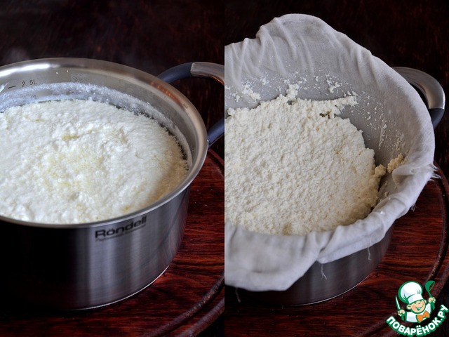 Добавить чайную ложку морской соли. Буквально через несколько секунд молоко начнет сворачиваться. Как только молоко свернется, выключите газ, постоянно помешивая массу. Накройте дуршлаг чистой марлей. Поставьте его в кастрюлю большего размера. Процедите творог через сито. Марлю завяжите и подвесьте ее на кухонном смесителе на пару-тройку минут, чтобы излишки сыворотки стекли. Сыворотку потом можно использовать в выпечку.