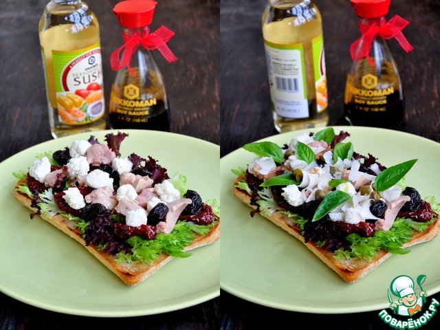 Салат порвать руками, выложить на чиаббату, сбрызнуть оливковым маслом.