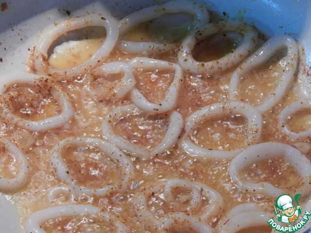 Поочередно обжариваем рыбу и кальмара в оливковом масле (3 ст. л.) со специями (с любыми - по вкусу, я использую чешский микс для рыбы), остужаем на салфетке - лишний жир нам ни к чему.