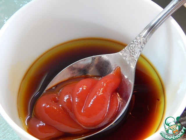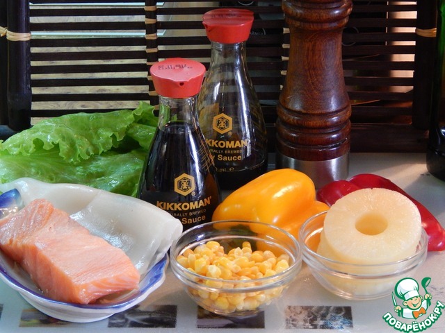 Готовим соус. В миске соединяем соевый соус "Киккоман", оливковое масло и кетчуп. Хорошенько взбиваем. Перец, ананас, кукурузу и салат соединяем. Сверху выкладываем кольца кальмара и рыбу, поливаем соусом при подаче.