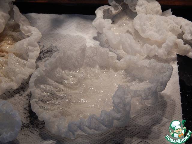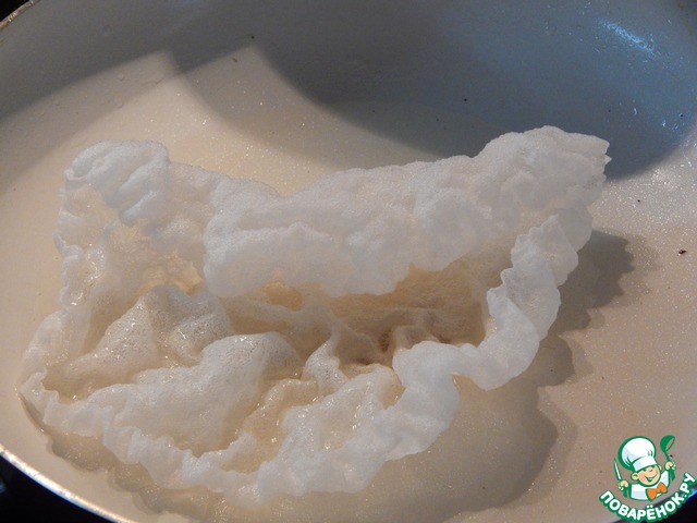 Предлагаю интересный вариант порционной подачи: рисовую бумагу на 1 минуту помещаем в воду, затем выкладываем в раскаленную сковороду с оливковым маслом.