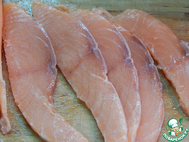 Рыбу нарезать поперек волокон тонкими ломтиками.