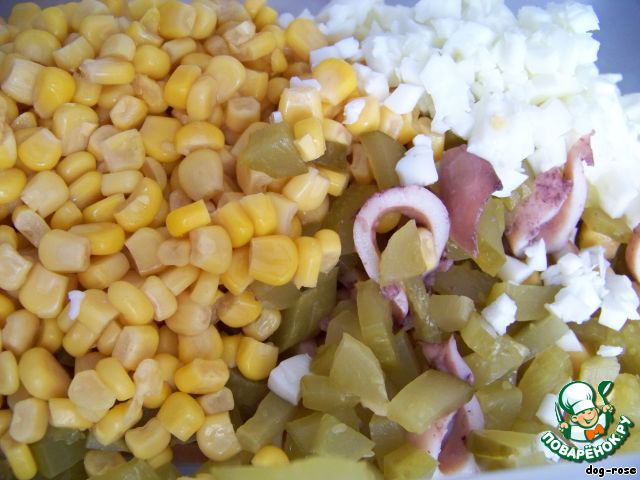Кальмаров нарезаем соломкой, огурец кусочками, яичные белки измельчаем. Все смешиваем, высыпаем туда же кукурузу из банки (без жидкости).
