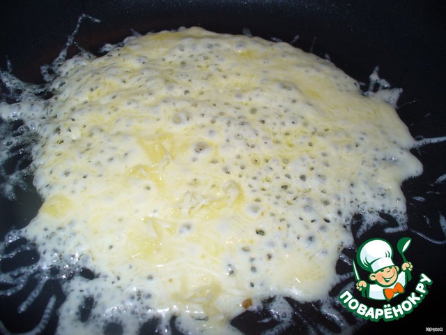 Сначала сделаем корзинки. Для этого нужно натереть сыр и выложить его ровным слоем на тефлоновую сковороду без масла. Поставить на огонь примерно на 2 минуты. Как расплавится, так сразу снять с огня и минут на 5 оставить на сковороде, чтобы немного остыл и "схватился".