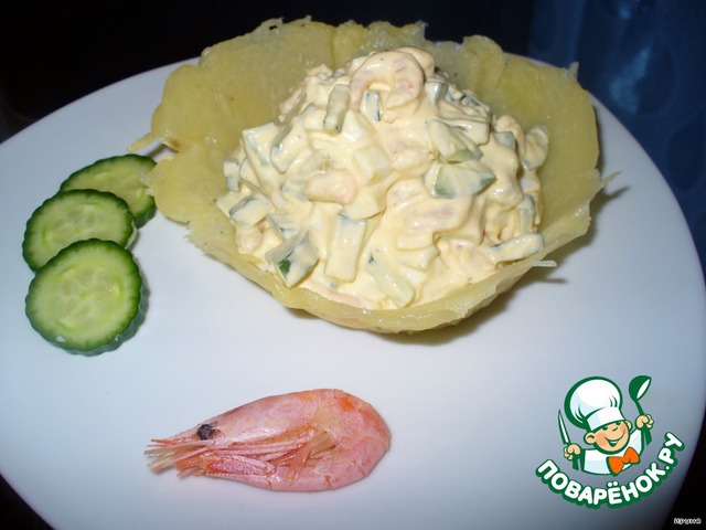 | Очень простой, очень вкусный, лeгкий и свеженький салатик. Подавать можно в различном оформлении. Сегодня у меня он в сырных корзиночках. Увидела как-то идею такого оформления по ТВ, теперь периодически пользуюсь. В рецепте так же показан повседневный вариант этого салатика с небольшими изменениями. Это блюдо отлично подойдет на праздничный стол и к конкурсу "Scarlett к 8 марта". |