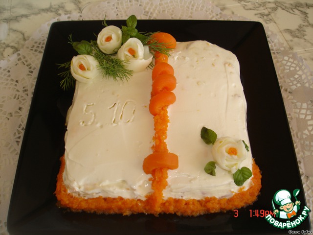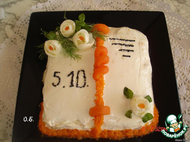 Украшаем тертой морковью, зеленью и нашими цветочками. Икрой наносим дату.