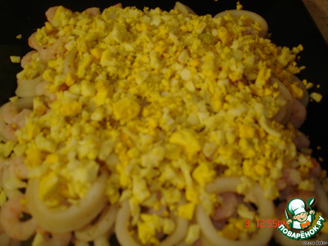 оставшийся белок и желток режим и укладываем сверху кальмаров и криветок