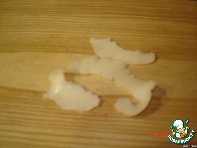 из белка яйца делаем подобие цветка. Острым ножом, как будто дрожащей рукой начинаем резать белок.