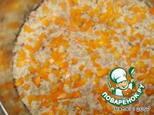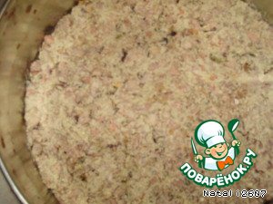 Эту массу выложить в форму на плоское блюдо (у меня съемная форма для торта, только верхняя часть, диаметр 26 см. А можно использовать вырезанную часть от пластмассовой большой бутылки, чтоб не было ни верха, ни дна). Равномерно разровнять.