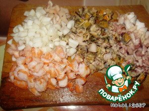 Морской коктейль, креветки (7 шт.) и кальмары разморозить.