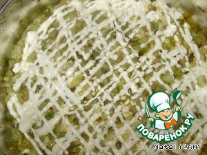 Приготовить заправку: майонез, сметана, чуть соли и перца.
