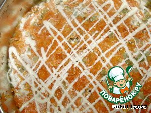 Отварную, очищенную морковь натереть на крупной терке. Выложить на салат, разровнять и сделать сеточку из заправки.