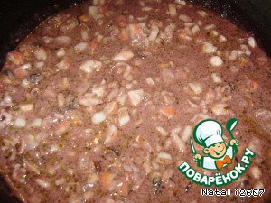 Влить вино и дать закипеть. Выпарить 1-2 минуты, чтоб вышел алкоголь.
