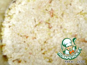 С кукурузы слить жидкость. Выложить сверху на салат и промазать заправкой, хорошо при этом приминая.
