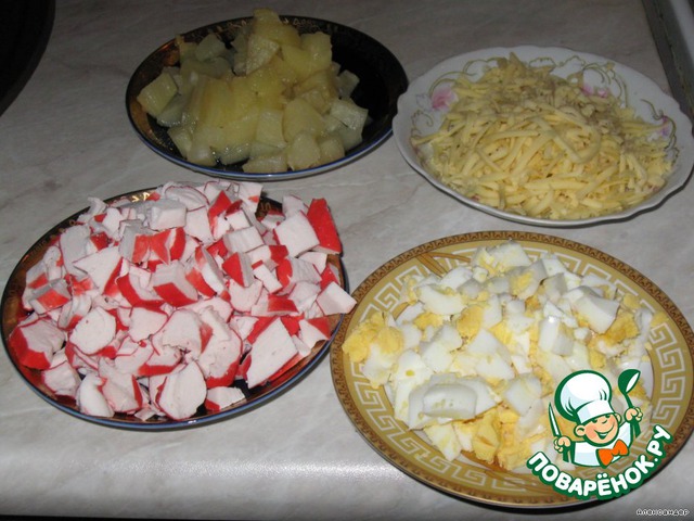 Отварные яйца, сыр, крабовое мясо, ананасы конс. и зеленый лук нарезать. Приправить майонезом и украсить креветками и маслинами.