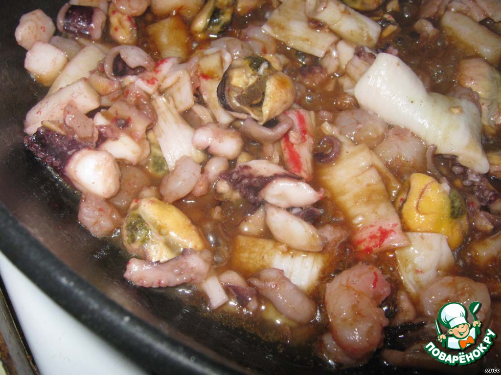 Берём замороженный морской коктейль, его можно отварить (около 5 минут), но я предпочитаю обжарить до выпаривания жидкости на оливковом масле.