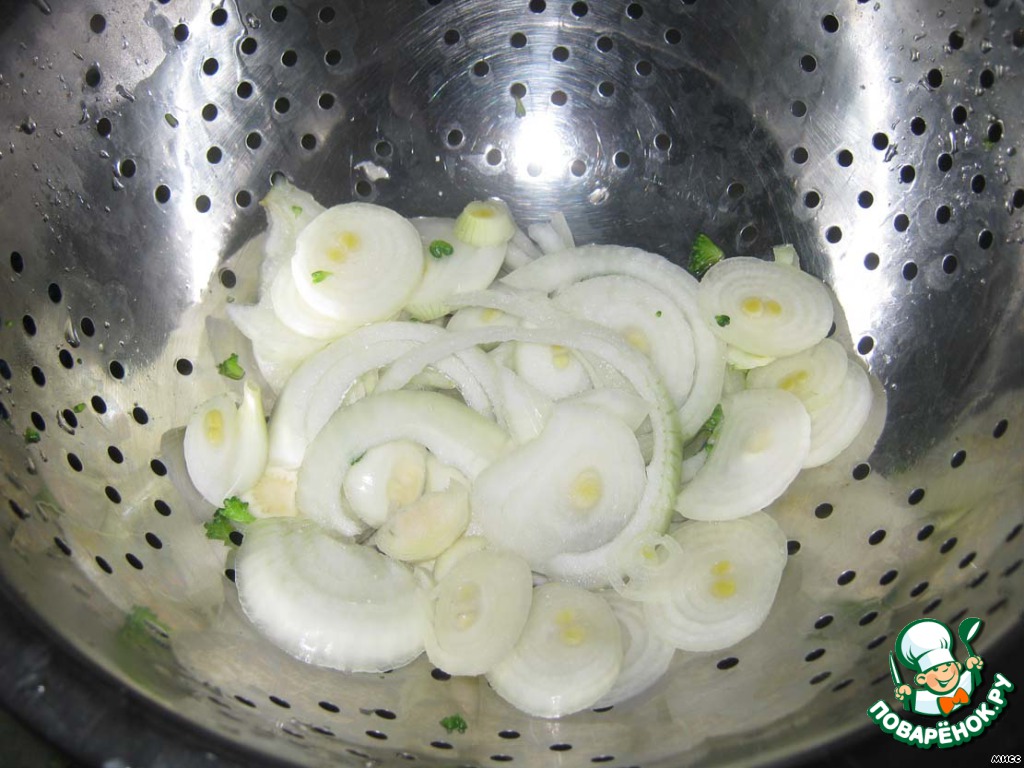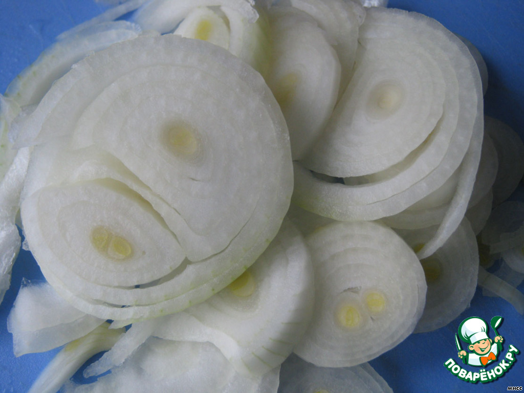 Вот лук у меня свой, некрупный, поэтому брала 2 головки, нарезаем тонкими кольцами.