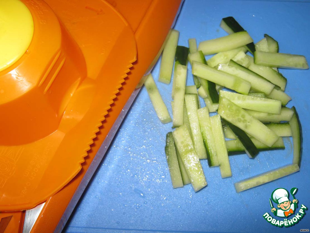 Огурцы нарезаем (я использовала тёрку) брусочками.