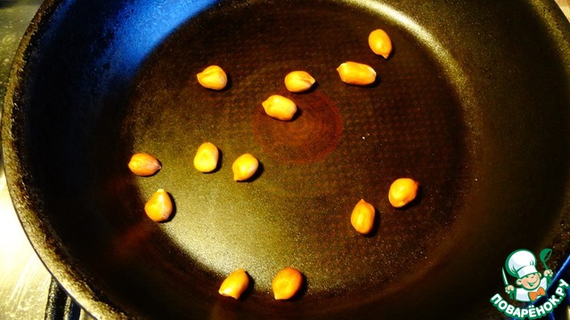 На сухой сковородке немного поджарить горсть арахисовых орехов.