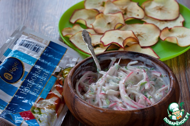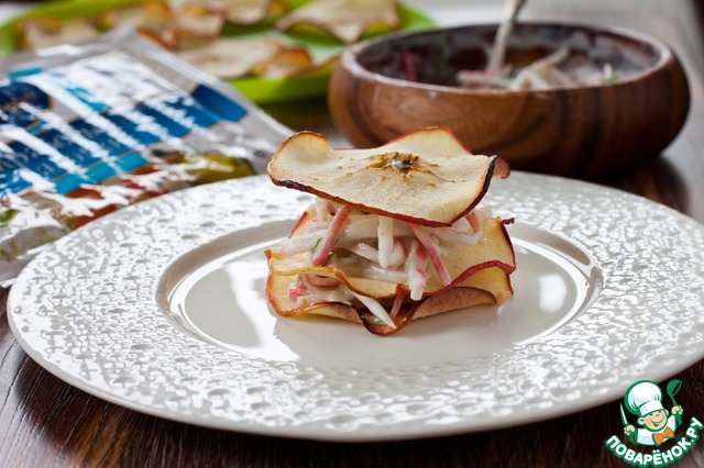| Приятный на вкус салат в порционной подаче. Яблочные чипсы и вкусная заправка сделают этот простой рецепт незабываемым для ваших гостей. |