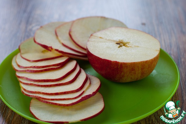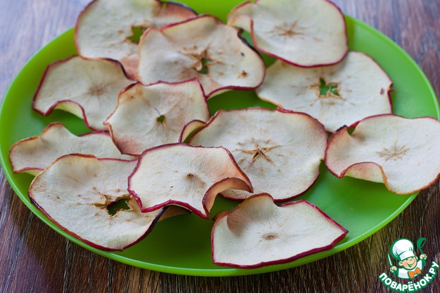 Крупное яблоко при помощи мандолины нарезать тонкими ломтиками. Подсушить в духовке 20-30 минут при 180 градусах.