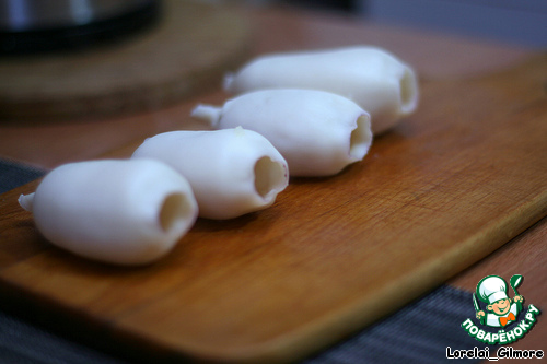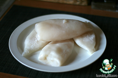 Тушки кальмаров положить в кипящую воду на 7-8 минут.