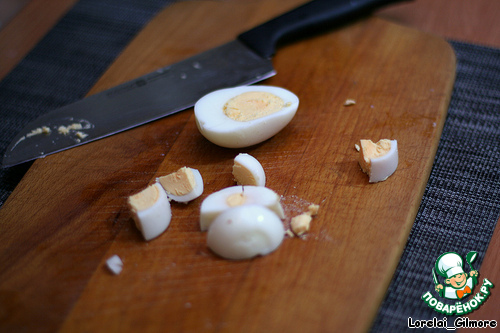 Сварить 4 яйца вкрутую, нарезать (не очень мелко).