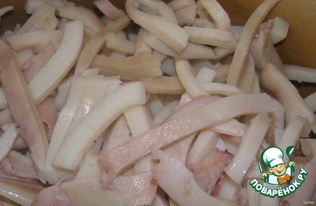 Кальмары отвариваем и режем соломкой.
