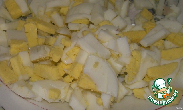 Яйца варим и мелко режем.