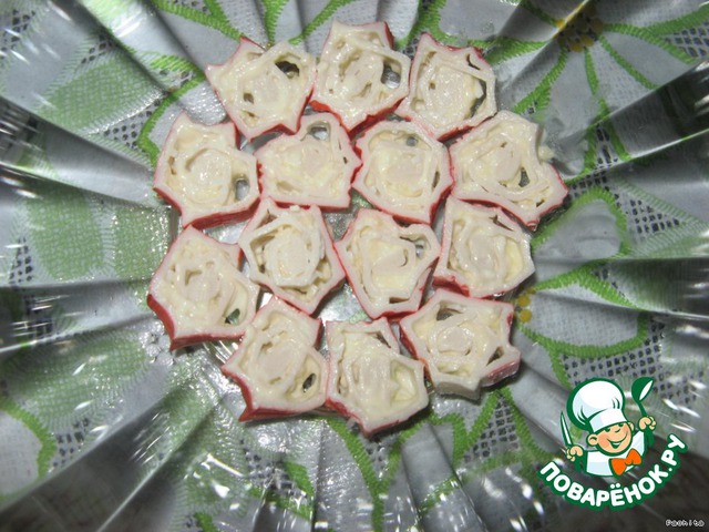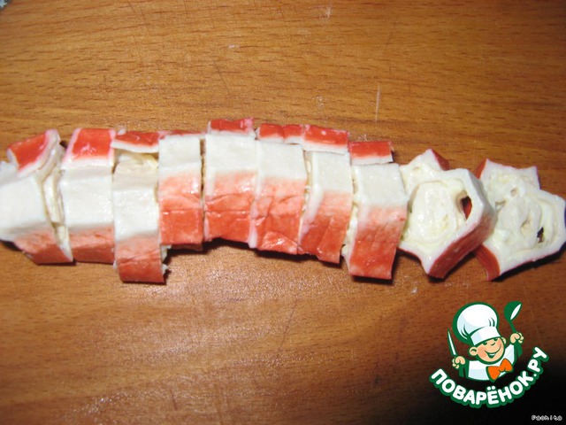 | Многие знают про фаршированные крабовые палочки. Я решила использовать эту идею в салат. |