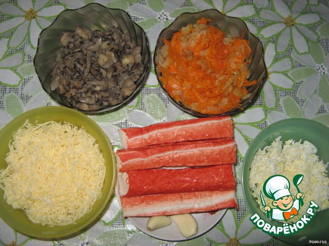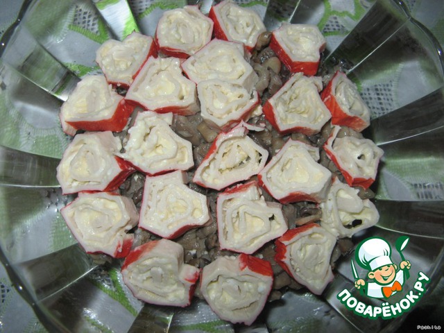 Выкладываем слоями, смазывая майонезом, в произвольном порядке, низ и верх должен состоять из кружков крабовых палочек.