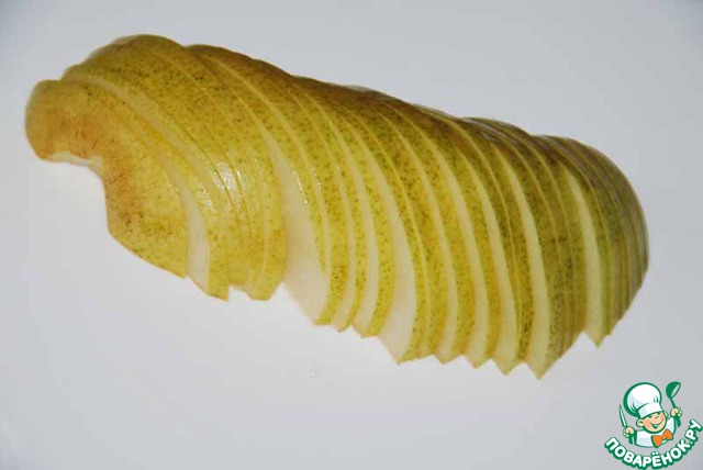 В груше вырезаем сердцевину и режем на тонкие сегменты.