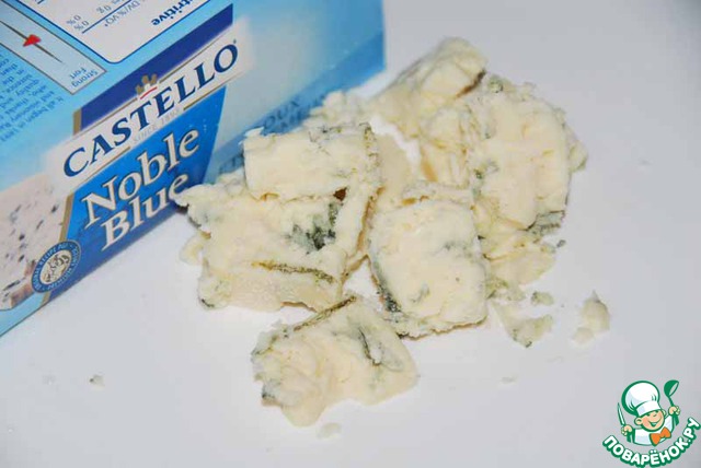 Берём мягкий сыр, у меня с голубой плесенью. Кстати, его в салате в ресторане я так и не обнаружила.