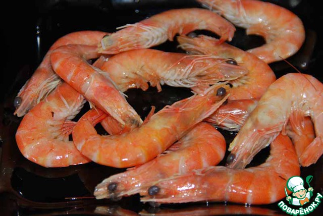 Креветки размораживаем и чистим, оставляя кончики хвостиков.