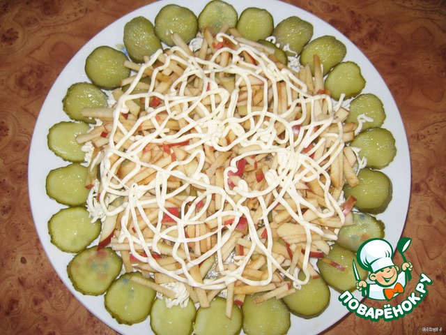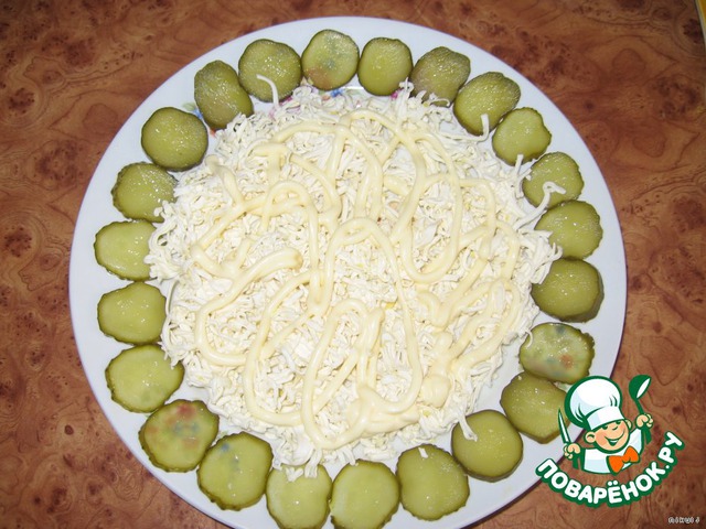 По краю блюда выложить нарезанный тонкими кружочками маринованный огурец, в центр тертый пл. сырок, майонез