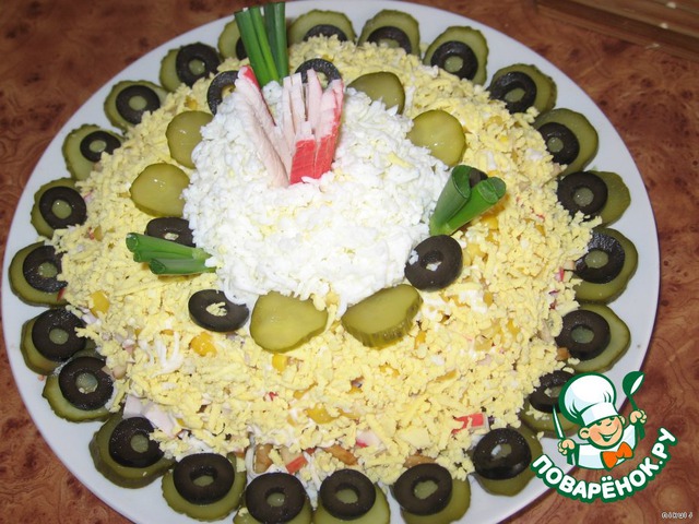 Сверху тертые яйца, украшаем маслинками, лучком, крабовой палочкой. Очень бысто и легко, красиво и вкусно (за обедом продегустировали)!!! Приятного аппетита!
