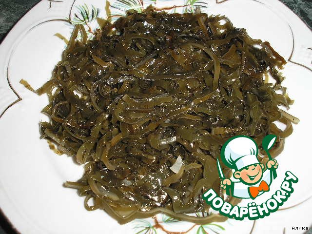 Половину баночки морской капусты выкладываем на блюдо.