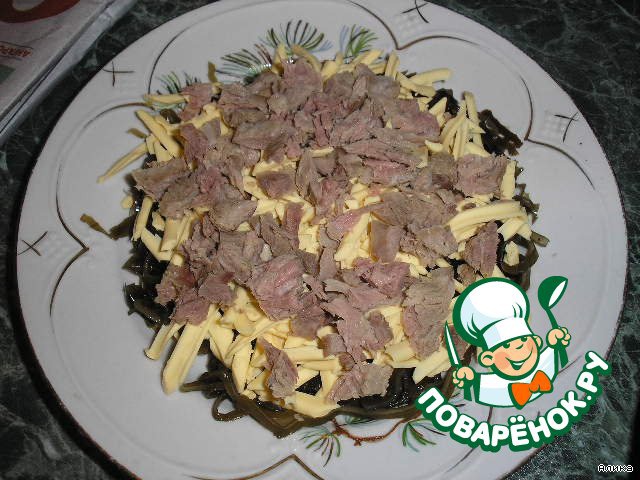Кладем на морскую капусту сыр и мясо.